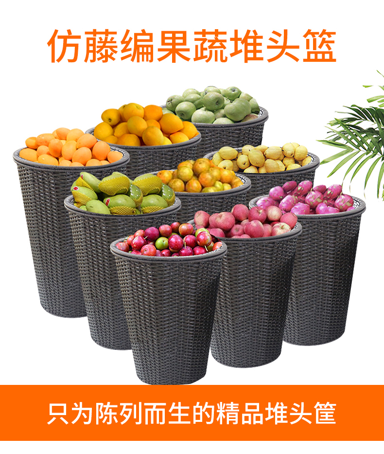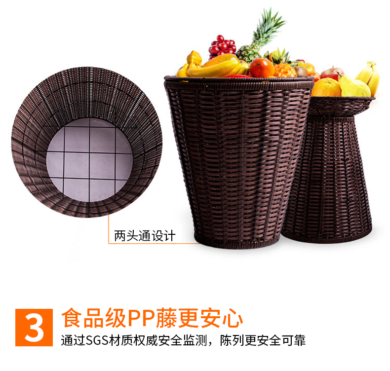 超市商场堆头筐,加粗骨架,让筐更牢固。两头通设计,食品级PP藤更安心,多种规格组合更方便。