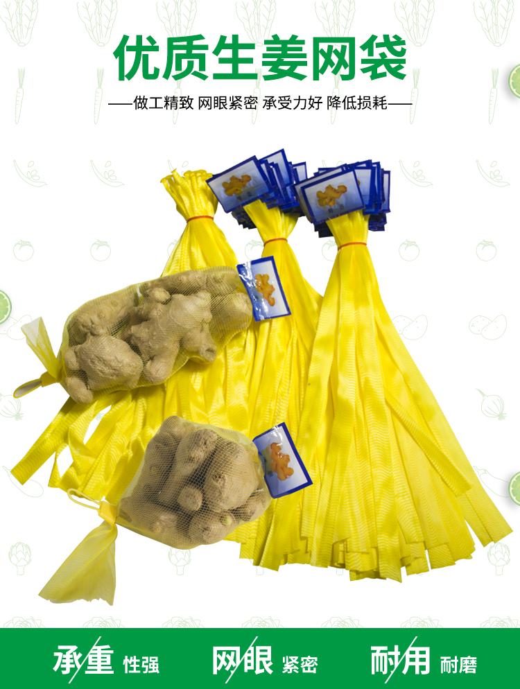 生姜包装网袋,镂空网袋,加大容量,采用优质PE材料,大小带标可定制。网眼紧密,不易破损,做工精致。适用于多种产品,用途更广更便捷。