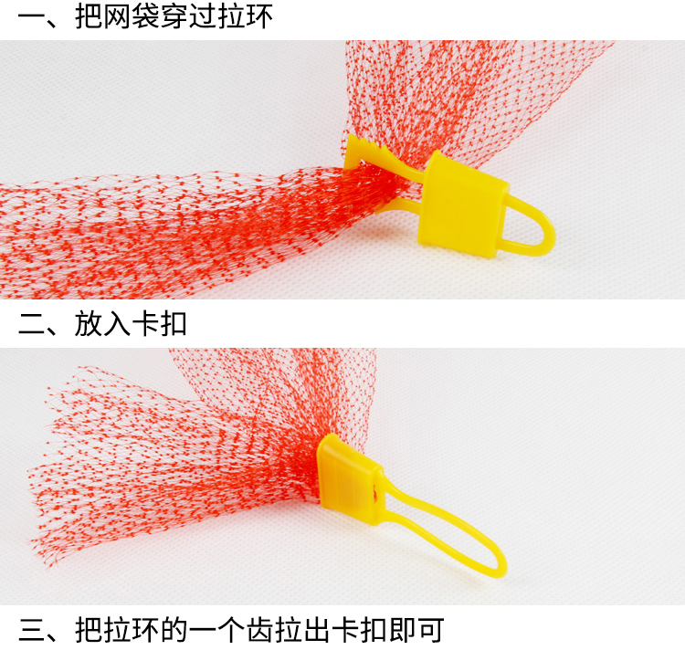 塑料网扣,新技术,新工艺,边缘光滑不扎手,更利于封口。色彩明亮艳丽,客人第一时间就能看到,提高购买率。封口比较美观,不会破坏网袋,不会对物品造成伤害。搭配网袋/置物筐搭配使用效果更佳。