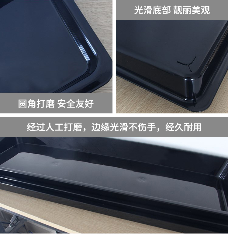 长方形商用冷鲜肉托盘黑色,光滑底部,亮丽美观,圆角打磨,安全友好,经过人工打磨,边缘光滑不伤手。食品级材质,耐磨耐用,易清洗。厂家直销,质量保证。